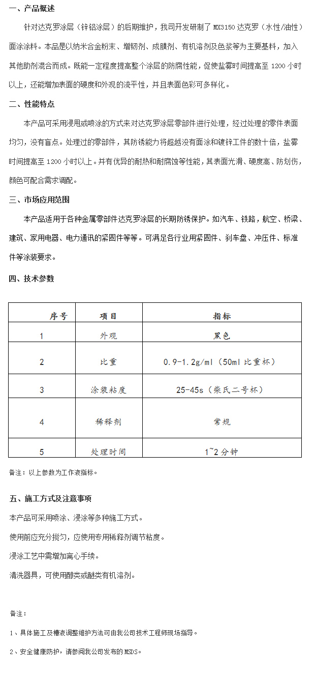產(chǎn)品名稱:MX3150達(dá)克羅面涂涂料(黑色)