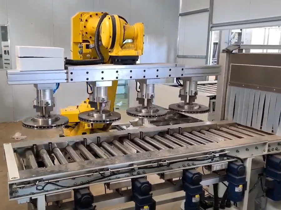 剎車盤轉(zhuǎn)送到涂裝車間的上線位置,用帶有視覺(jué)識(shí)別系統(tǒng)的機(jī)器人進(jìn)行上線。